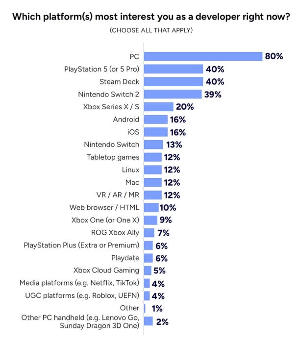 В State of the Game Industry Survey (более 2300 представителей индустрии) участникам разрешили указать любое количество интересующих платформ. Картина жёсткая: PC выбрали 80% опрошенных, PS5 — 40%, Nintendo Switch 2 — 39%, а Xbox Series X|S — только 20%. Это уровень, близкий к мобильному сегменту, и разрыв слишком велик, чтобы говорить о временном спаде.
