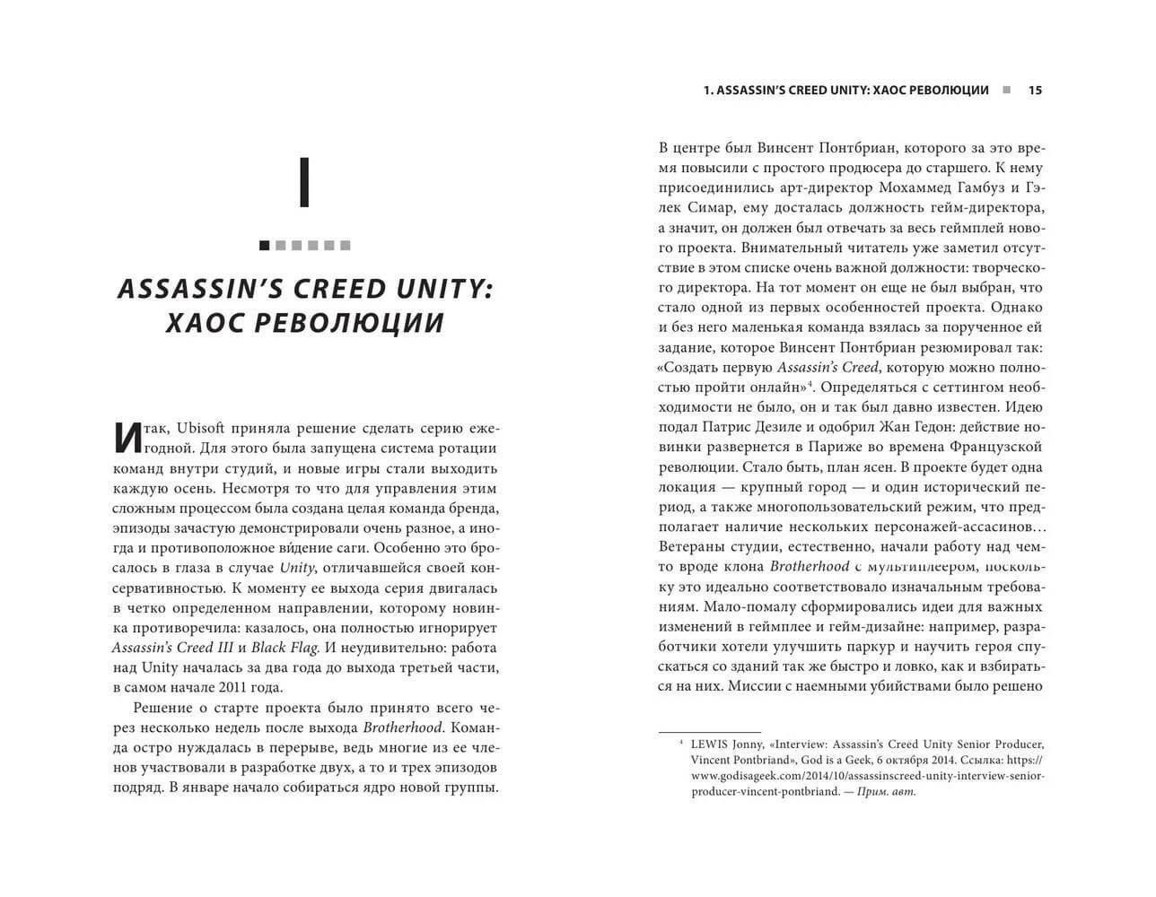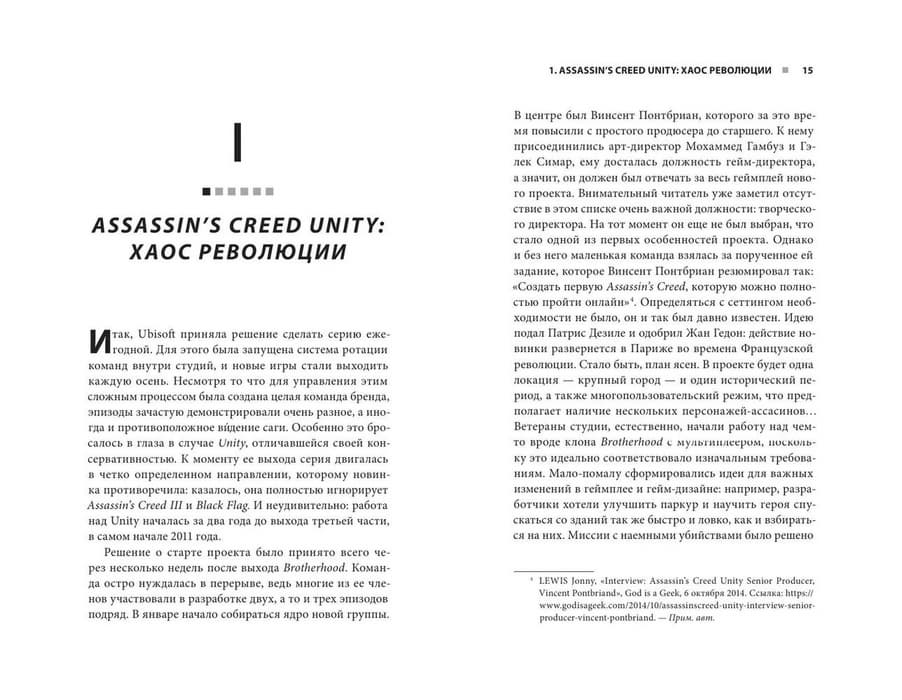 Авторы разбирают, как камерный стелс превратился в гигантскую RPG с мифологией и богами, почему «Единство» разобщило разработчиков и каким образом на противостояние тамплиеров с ассасинами повлиял сериал LOST («Остаться в живых»).