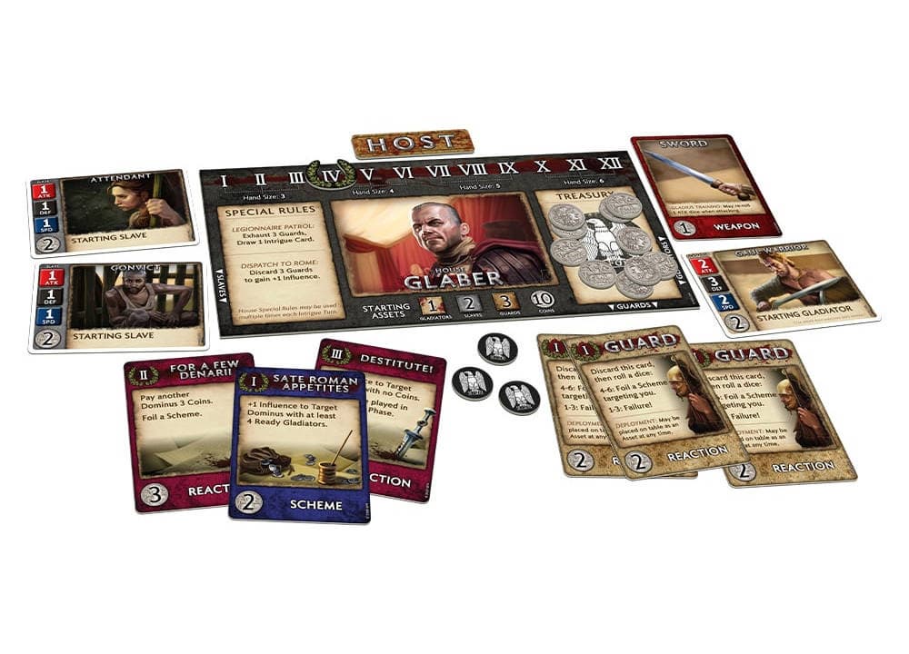 Каждый доминус получает в распоряжение всевозможные ресурсы для осуществления своих планов. Стражи охраняют игрока от интриг соперников, а рабы ведут хозяйство и заботятся о достатке дома. Также участники владеют школами гладиаторов, с помощью которых получится раздобыть славу и влияние.