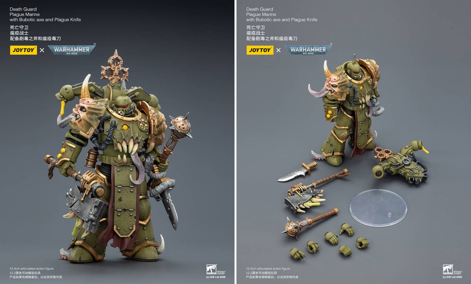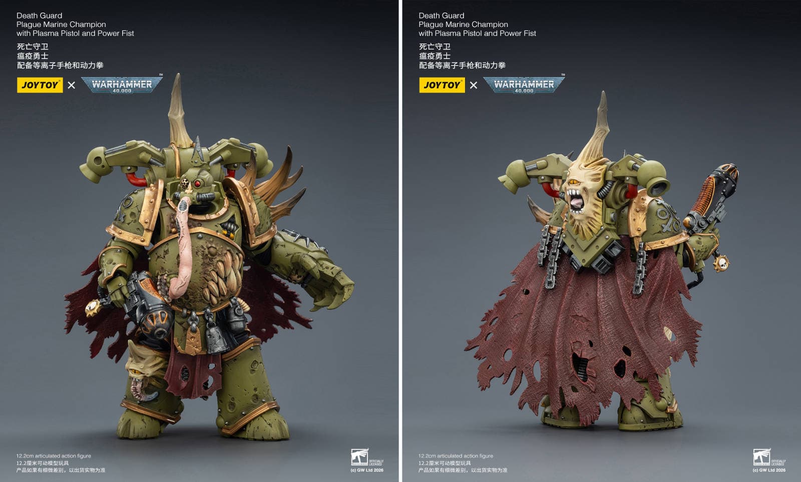 Фанатам вселенной Warhammer 40,000 стоит запастись костюмами химзащиты, так как компания JoyToy показала новые фигурки чумного космодесантника и чемпиона чумных космодесантников, выполненные в масштабе 1/18.