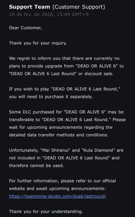 Информация стала известна после запроса игрока в службу поддержки Koei Tecmo. Ответ был однозначным: никаких специальных предложений для текущих владельцев игры не планируется.