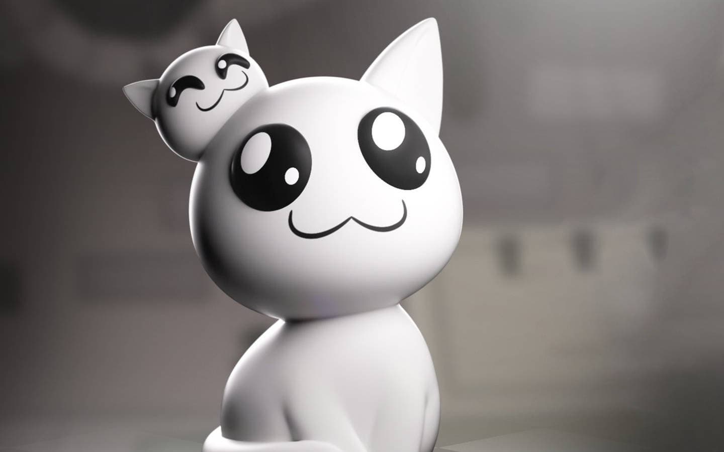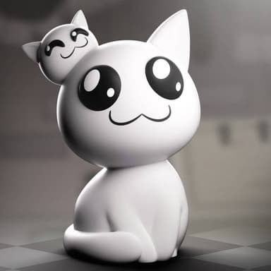 Эта серая кошка ростом 11,2 см сидит, аккуратно обернув длинный хвост вокруг тела перед скрещенными лапами. Она радостно смотрит вверх огромными круглыми чёрными глазами и улыбается, а вместо правого уха у неё голова очаровательного котенка.