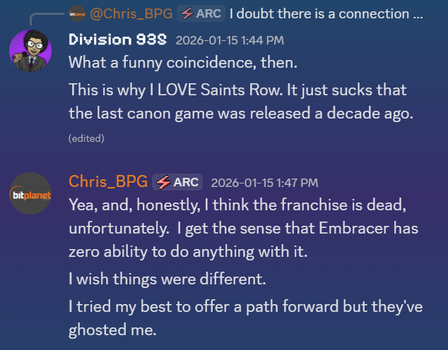 Бывший дизайн-директор оригинальной Saints Row Крис Стокман рассказал, что представил Embracer концепцию приквела, действие которого разворачивалось бы в 1970-е годы, однако ответа от владельца прав так и не получил. При этом ещё в ноябре 2025 года он сообщал, что компания сама обратилась к нему с просьбой подготовить концепт возможного перезапуска. После первоначального интереса Embracer перестала выходить на связь и не давала комментариев.