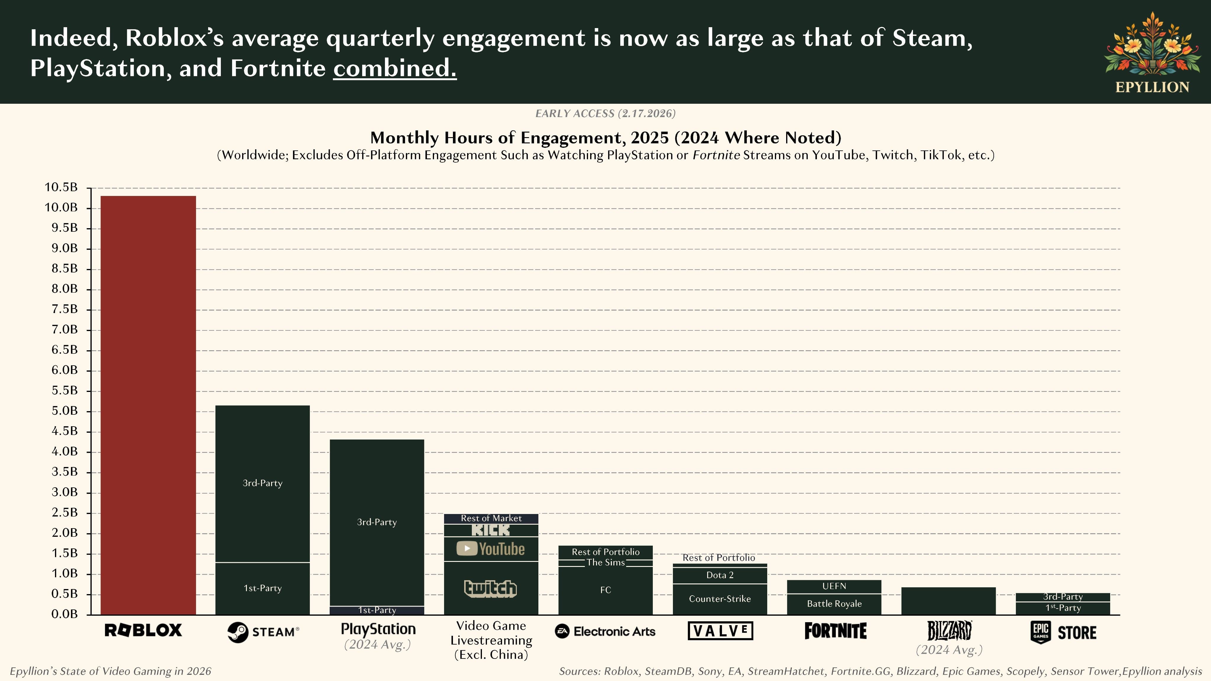 Согласно отчёту, в 2025 году пользователи Roblox проводили на платформе в среднем 10,3 млрд часов в месяц. Для сравнения, Steam генерирует около 5,1 млрд часов, а PlayStation — 4,3 млрд. Таким образом, Roblox не только опережает каждую из платформ по отдельности, но и превосходит их суммарный показатель.
