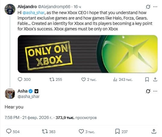 Новая руководительница, Аша Шарма, начала общение с игроками, чтобы понять их ожидания. Недавно один из игроков написал ей, что именно эксклюзивы – Halo, Gears, Forza, Fable – формировали идентичность Xbox и должны оставаться доступными только на консолях бренда.