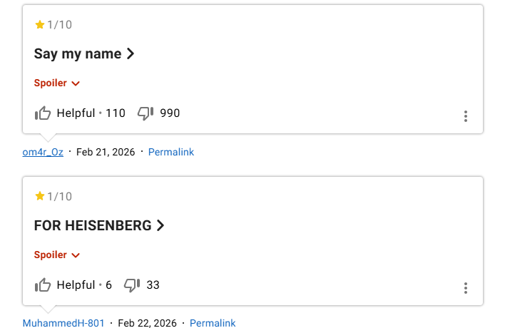 В отзывах к шестому эпизоду «Рыцаря Семи Королевств» уже появляются знакомые формулировки — «За Хайзенберга», «Назови моё имя» и другие прямые отсылки. Причём негативные оценки начали публиковать ещё до официального релиза серии. Пятый эпизод «Рыцаря» сейчас также держится на 9,6 при 143 тысячах голосов, что указывает на активную поддержку аудитории, компенсирующей поток низких оценок.