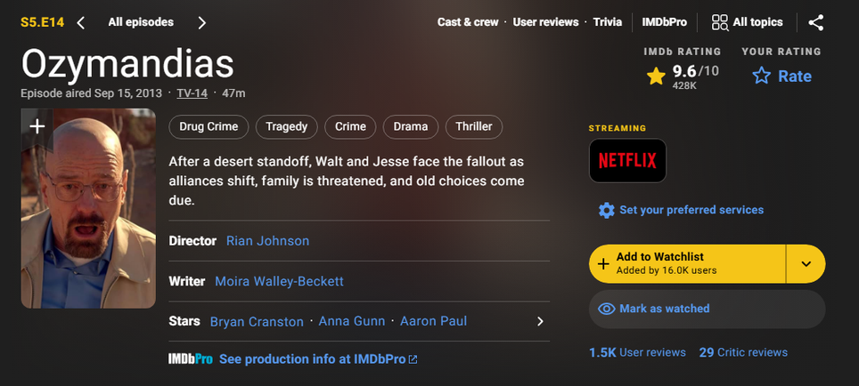 Напомним, что после того как пятый эпизод «Рыцаря Семи Королевств» получил идеальную десятку на IMDb, фанаты «Во все тяжкие» начали массово ставить «единицы» новому шоу. В ответ поклонники «Рыцаря» атаковали культовый эпизод «Озимандия». Если раньше эпизод удерживал 10/10, то теперь его рейтинг опустился до 9,6 при 428 тысячах оценок.