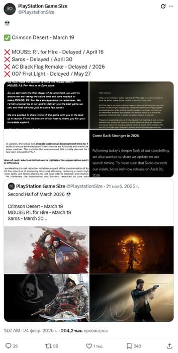 Ранее март обещал настоящий шквал релизов: Soros (20.03), 007 First Light (27.03), Mouse: P.I. for Hire (19.03) и возможное появление Assassin’s Creed: Black Flag Resynced (23–30.03). Однако большинство игр уже перенесены, а на мартовской сцене остаётся лишь Crimson Desert.