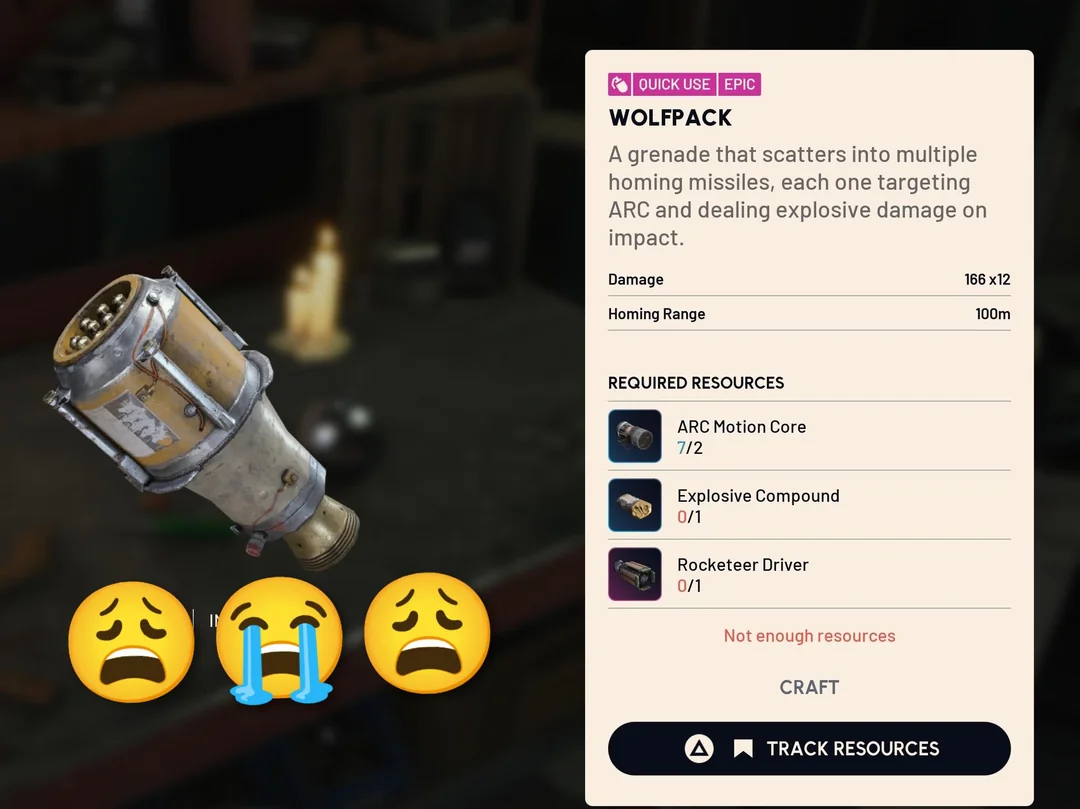 Популярная граната Wolfpack («Волчья стая») получила своеобразный нерф. Её характеристики остались прежними, однако теперь для её крафта дополнительно потребуется использовать редкую деталь, которую выбивают из «Ракетчика».