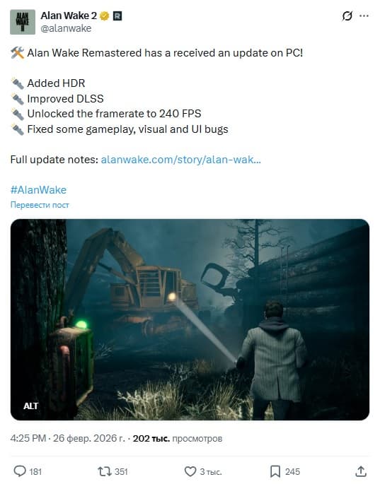 Remedy Entertainment не забывает о прошлых проектах и выпустила важное обновление для PC-версии Alan Wake Remastered.