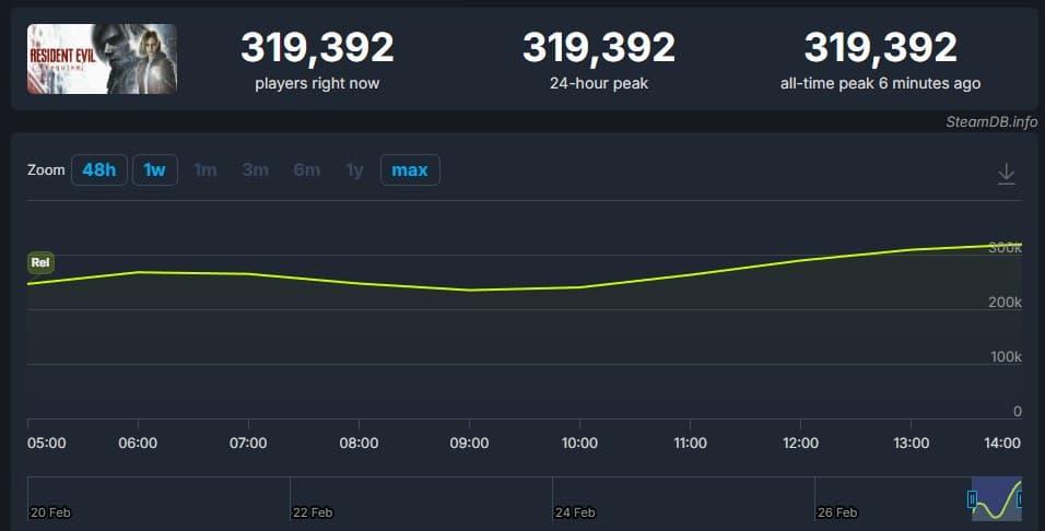 Согласно данным SteamDB, онлайн Resident Evil Requiem вплотную приблизился к отметке в 320 тысяч человек, что является абсолютным рекордом для серии хорроров от Capcom. Не исключено, что Requiem побъет свой же рекорд на этих выходных.