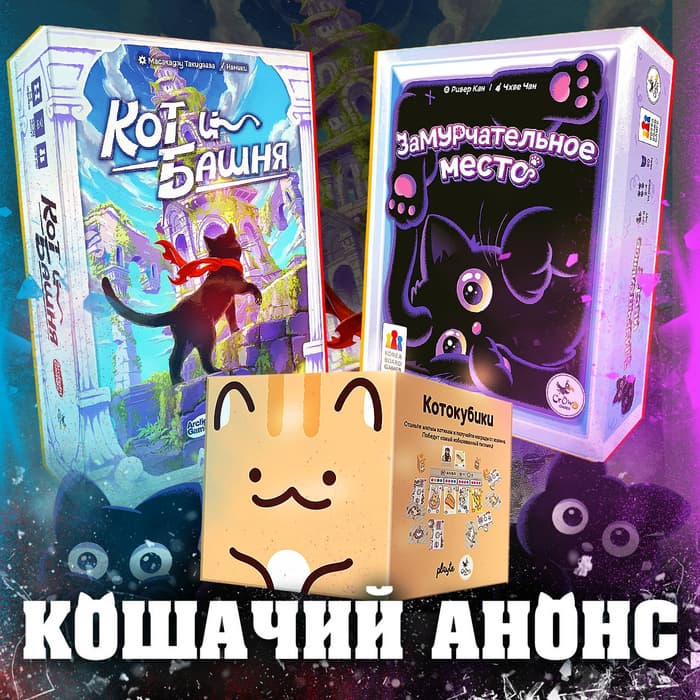 Издательство Crowd Games решило закидать фанатов усатых питомцев новыми проектами. Стало известно, что оно выпустит на русском языке такие настольные игры, как «Кот и башня» (Cat and the Tower), «Котокубики» (Meow Meow Dice) и «Замурчательное место» (Purrfect Place).