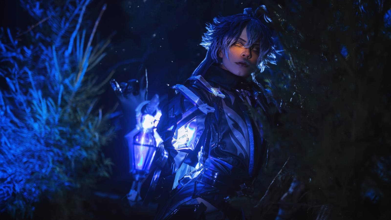 Модель Ксения «Ripka Koyo» Коё перевоплотилась в Кирилла Чудомировича Флинса из Genshin Impact, который каждую ночь поднимает свой призрачно-голубой фонарь, наблюдая за холодными водами и островами Нод-Края.