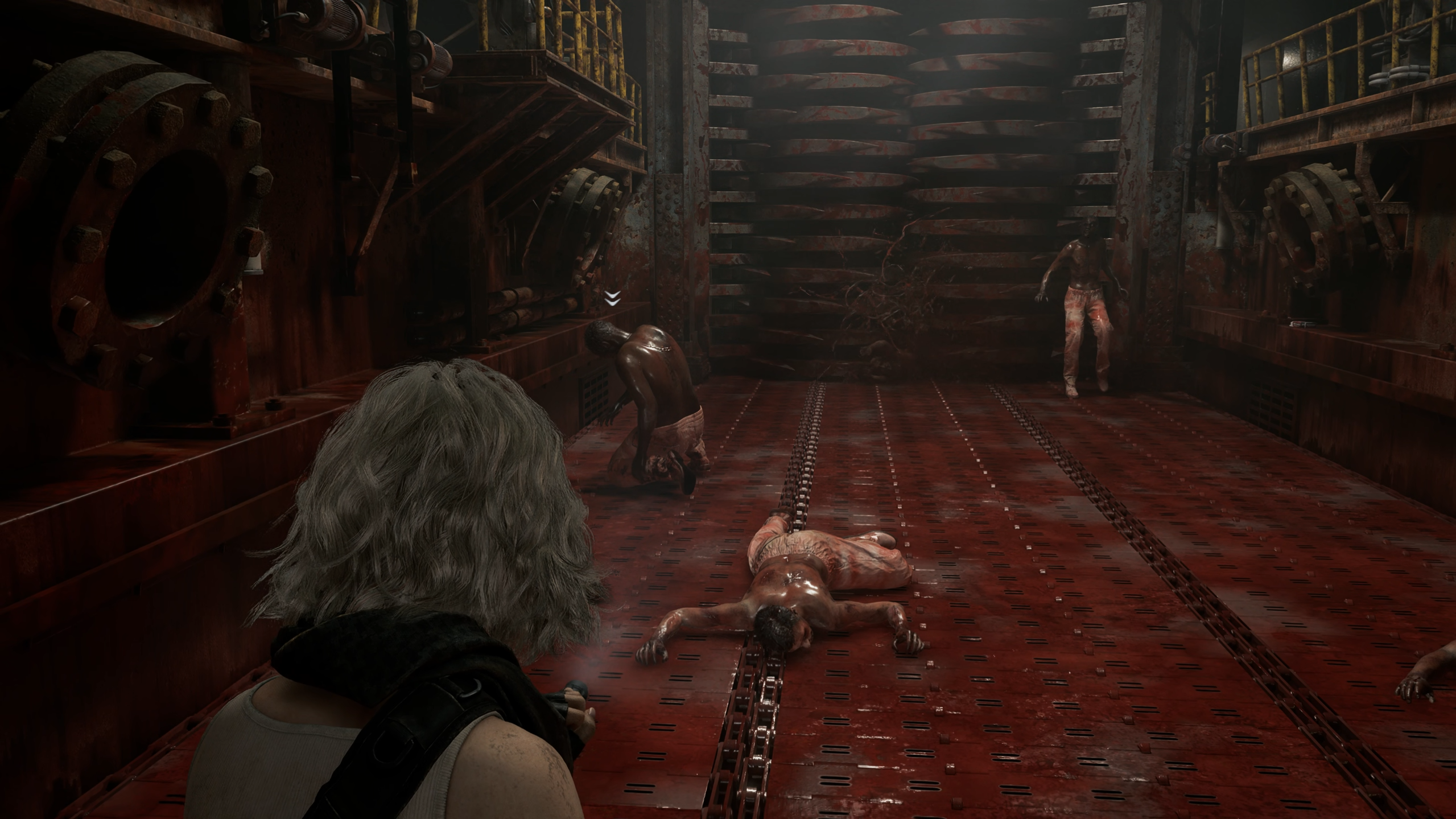 После слива крови спуститесь по лестнице. Начнётся фаза переработки: включится конвейер, и тела зомби начнёт перемалывать дробилка.