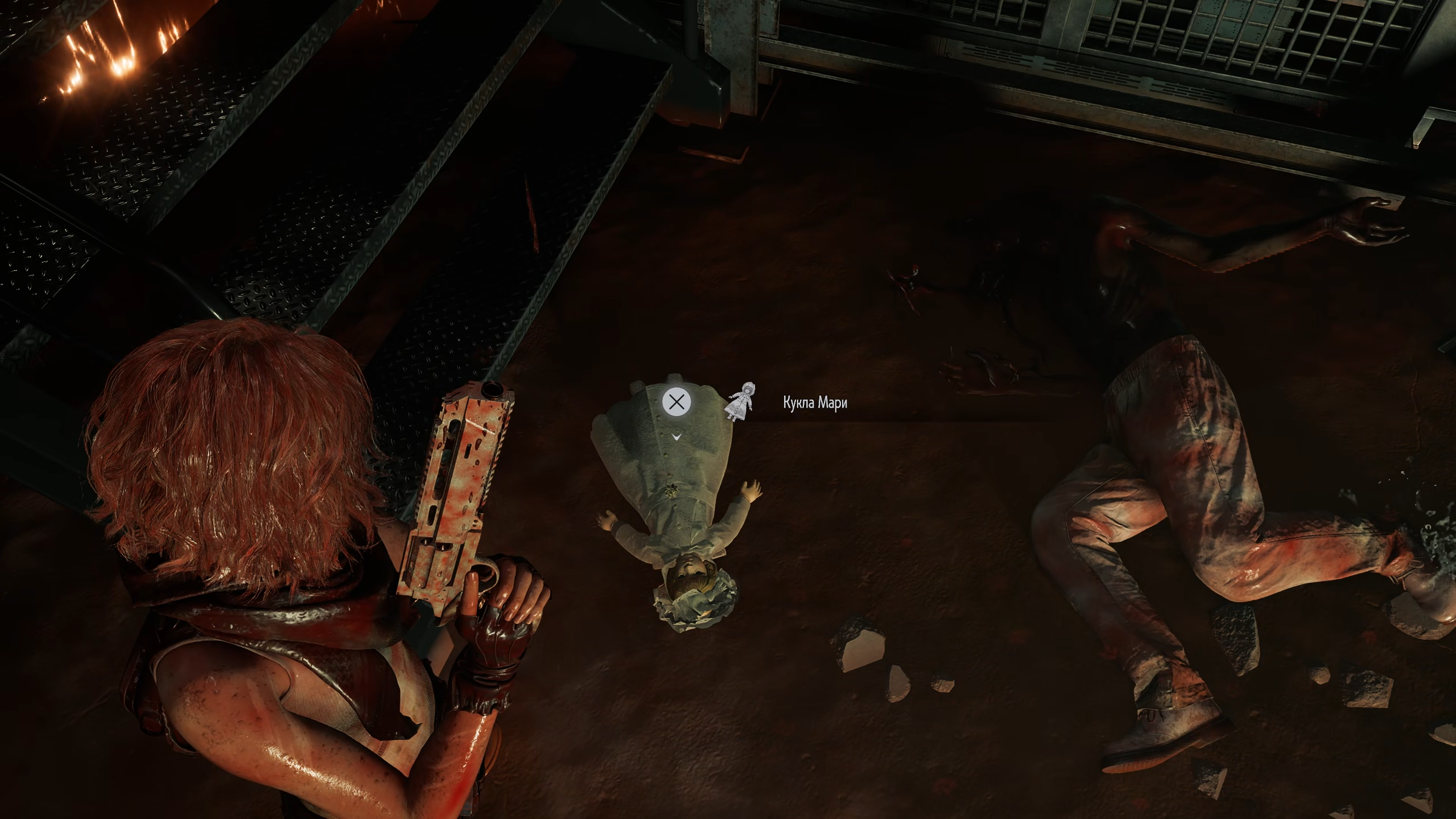 Если предыдущие шаги выполнены правильно, возле лестницы в этом помещении будет лежать кукла Мари. Пропустить её почти невозможно — просто следуйте маршруту эвакуации и смотрите под ноги. Подняв куклу, завершите игру с ней в инвентаре.