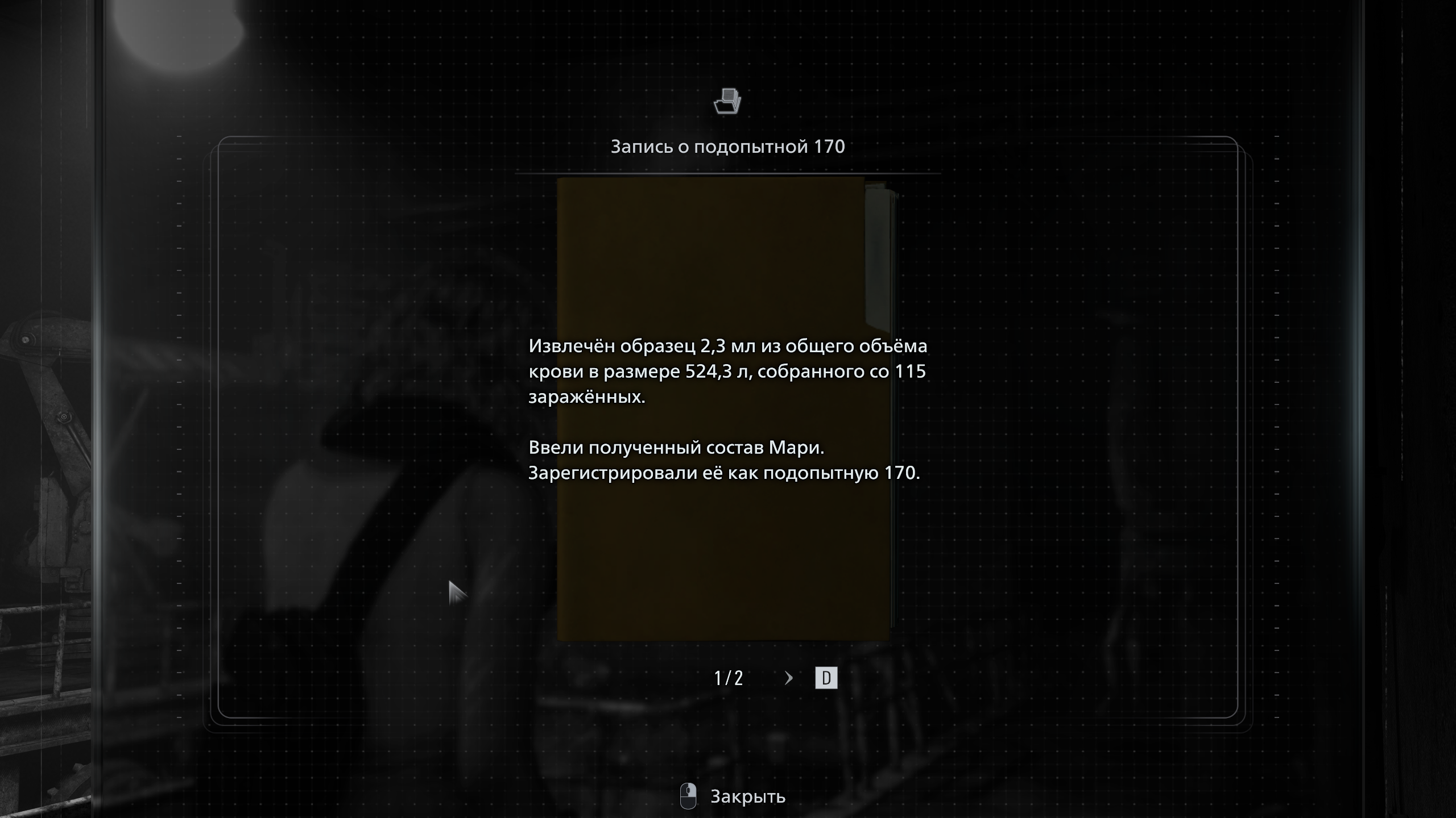 Примечание: этот шаг связан с документом «Запись о подопытной 170». Этой подопытной и была сбежавшая девочка Мари — Девочка, которая преследует Грейс в медцентре. В записи говорится о сборе крови со 115 заражённых.