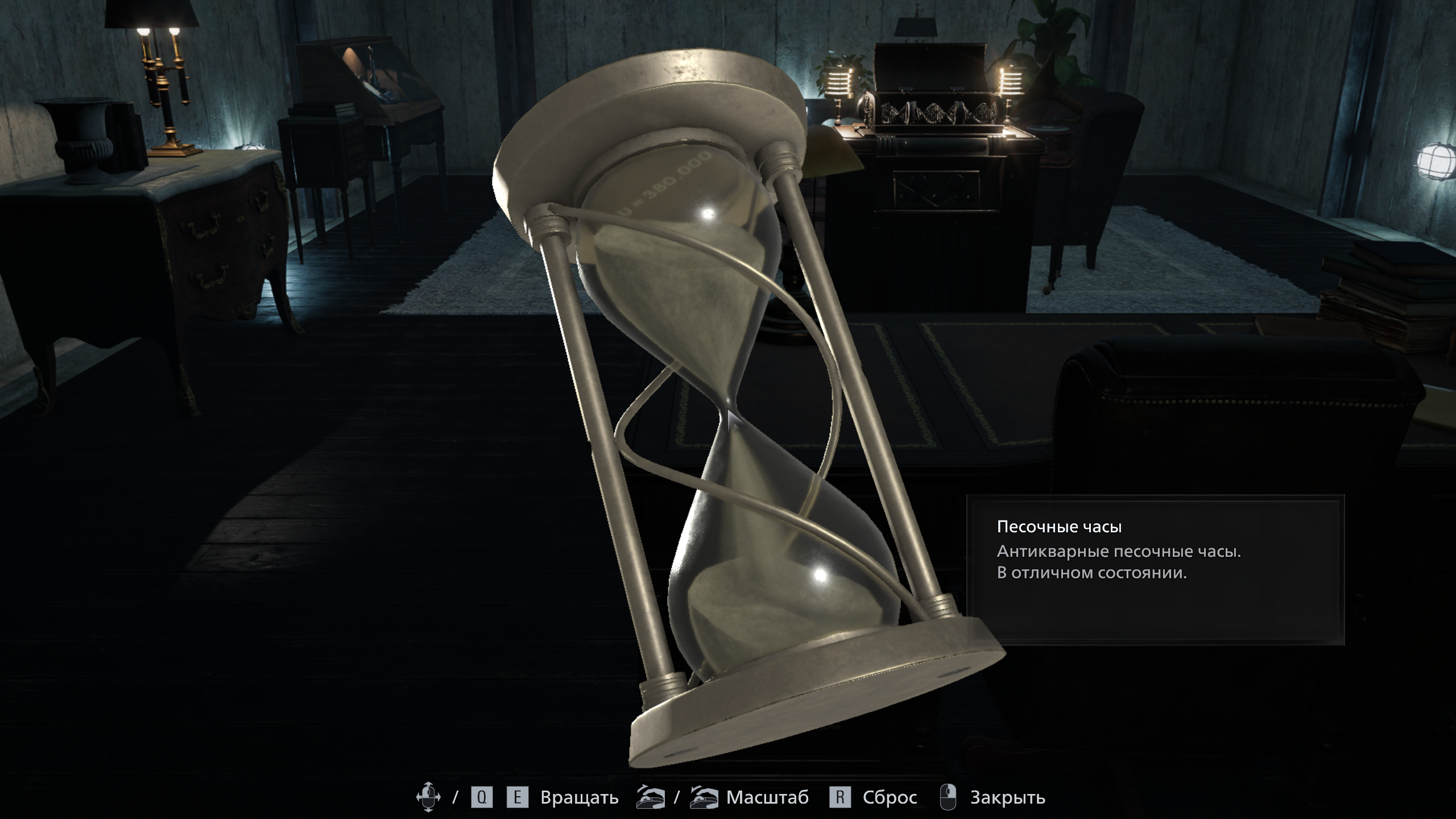 Следующая подсказка находится в VIP-комнате, которую Грейс посещает в поисках ключей от вертолёта. Осмотрите песочные часы на столе. Если взаимодействовать с ними и снять винты, часы можно перевернуть. Когда часть песка осыплется вниз, станет видна надпись: U = 380000