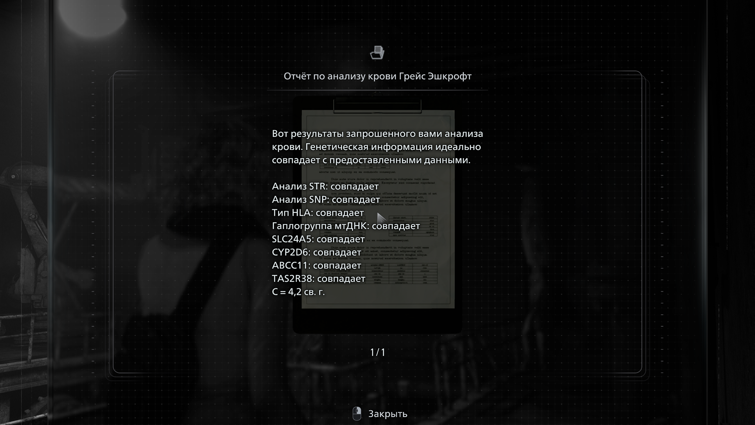 Последняя подсказка находится в частной лаборатории исследовательского комплекса. На столе лежит документ «Отчёт по анализу крови Грейс Эшкрофт». В нижней строке указано: C = 4,2 св. г.