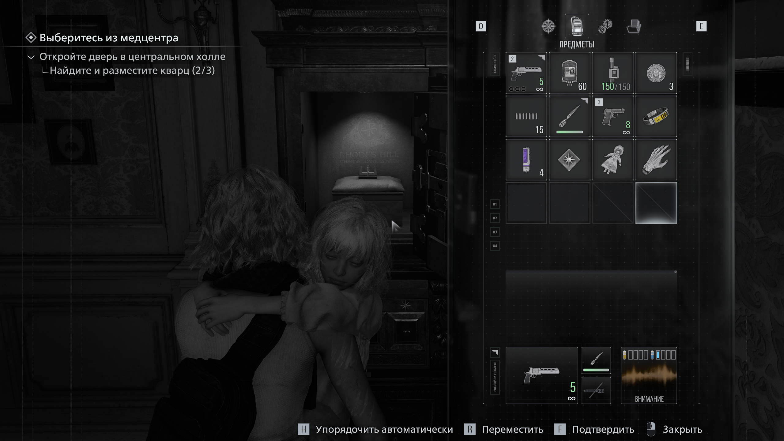 После завершения игры загрузите сохранение из шага 7 или начните новую игру. Доберитесь до момента, когда Грейс выберется из подвала Роудс-Хилл и будет носить Эмили на руках. Обязательно поднимите и проанализируйте «Оторванную руку» у лазерного микроскопа, иначе комбинация не сработает.