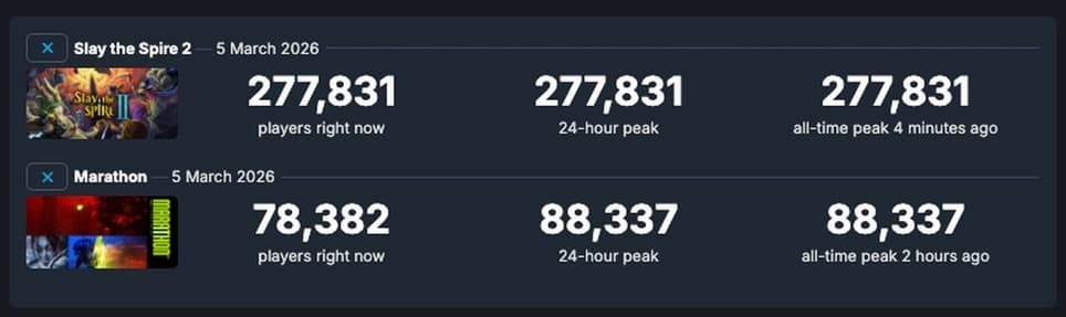 Главным хитом неожиданно оказалась Slay the Spire 2. Игра вышла в раннем доступе и сразу привлекла огромную аудиторию. По данным Steam, пиковый онлайн Marathon на старте составил около 88 тысяч игроков одновременно, тогда как Slay the Spire 2 превысила 277 тысяч.
