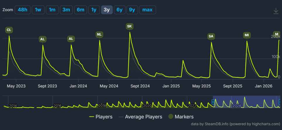 Пиковый онлайн превысил 190 тысяч игроков. У лиги «Секреты Атласа» этот показатель был на уровне 179 тыс, а у «Хранителей Пламени» — почти 186 тыс.