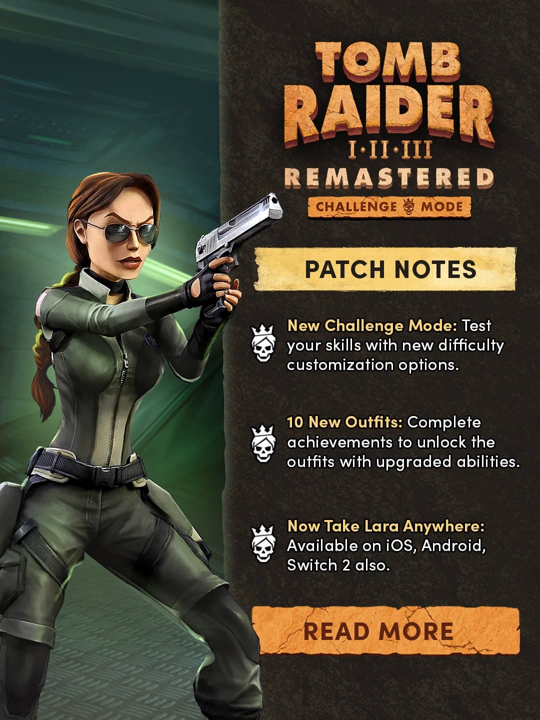 Новый Challenge Mode позволяет игрокам самостоятельно настраивать сложность с помощью множества модификаторов: менять здоровье Лары, урон, типы врагов и бонусы, создавая собственные варианты прохождения. Чем выше уровень вызова, тем больше наград и разблокировок.