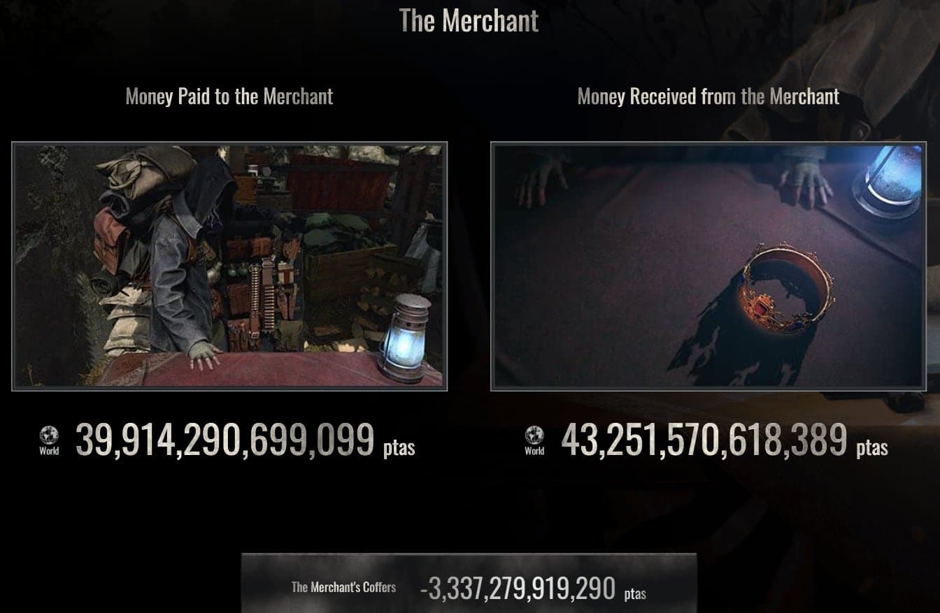 Согласно данным, основанным на всех транзакциях пользователей, загадочный продавец скупил у Леона и Ады гораздо больше товаров, чем продал. В итоге его «долг» достиг колоссальной суммы — 3,337,279,919,290 песет.