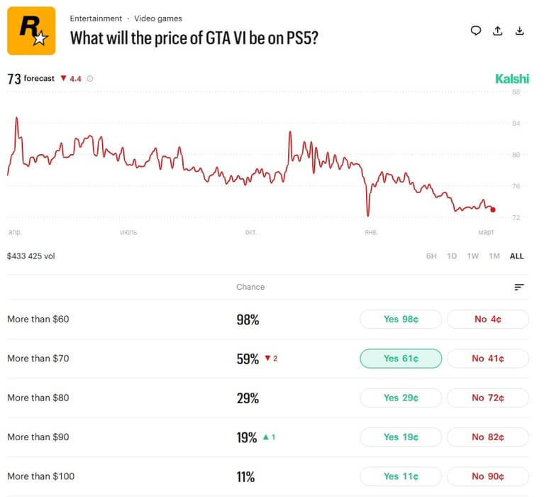 Официальная цена GTA VI до сих пор не раскрыта, но геймеры пытаются её предугадать, и всё меньше людей верят в стандартные $70. Согласно данным прогнозных рынков на портале Kalshi.com, большинство участников ожидают более высокую стоимость, чаще всего указывая на $80.