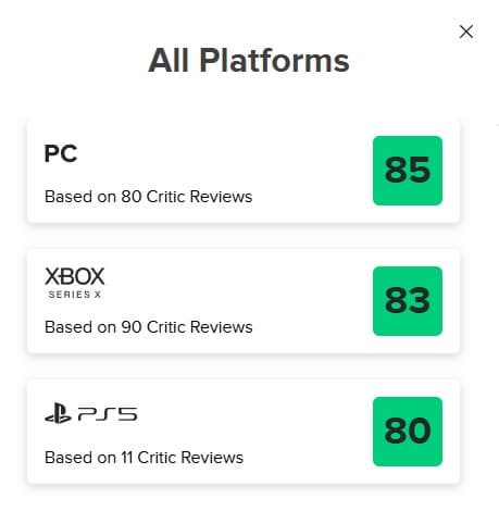 У версий для Xbox Series X и PC оценки выше, 83% и 85% соответственно, а также мнений редакторов намного больше.