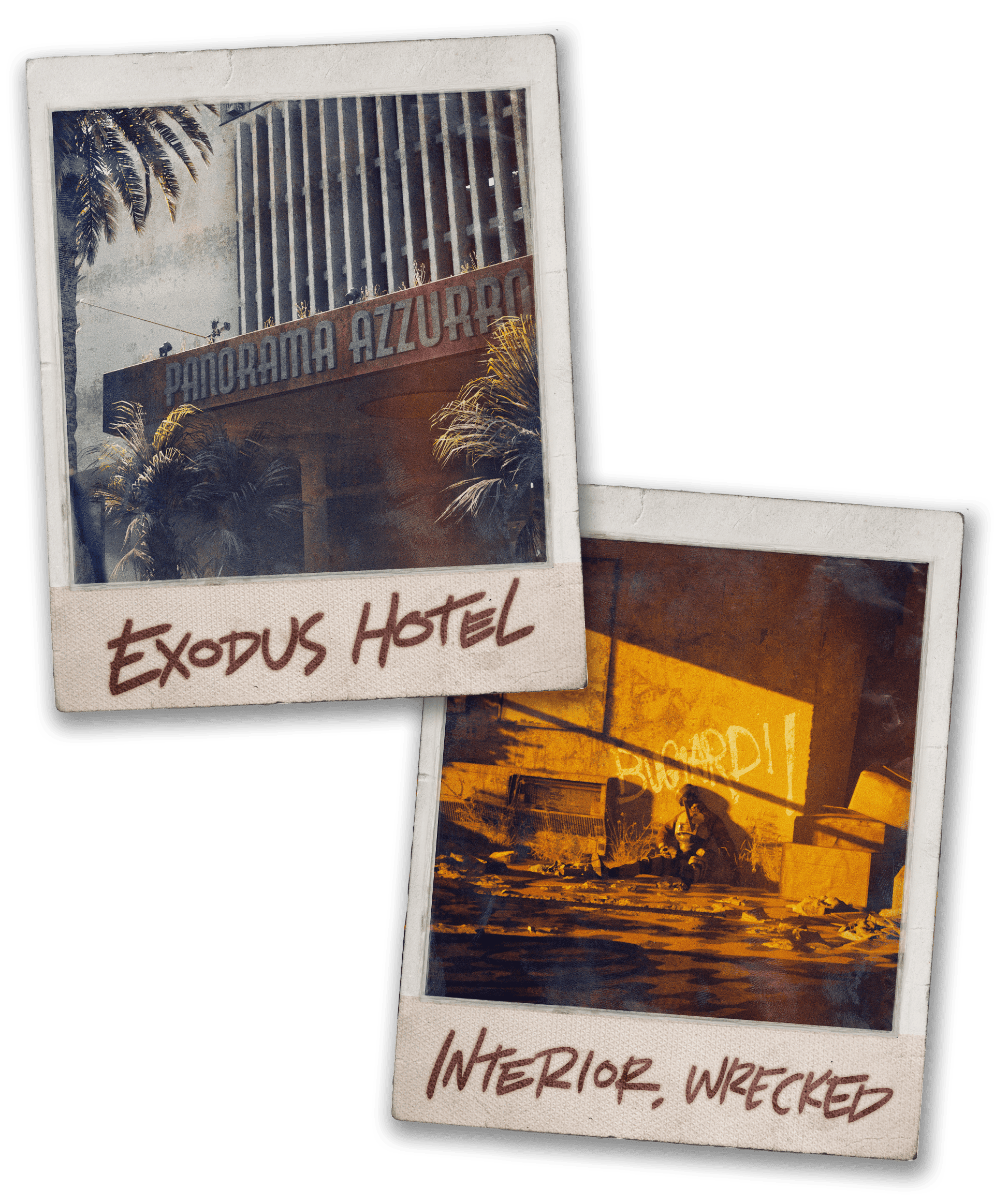 Место: Отель фасад/интерьер. Panorama Azzurro. Шани была права — старый курорт всё ещё держится. На стенах до сих пор можно найти афиши дискотеки. Хочу провести тщательный осмотр, но не уверен, что лестница не обрушится подо мной. Действие: Отмечаю координаты и возвращаюсь к теннисным кортам