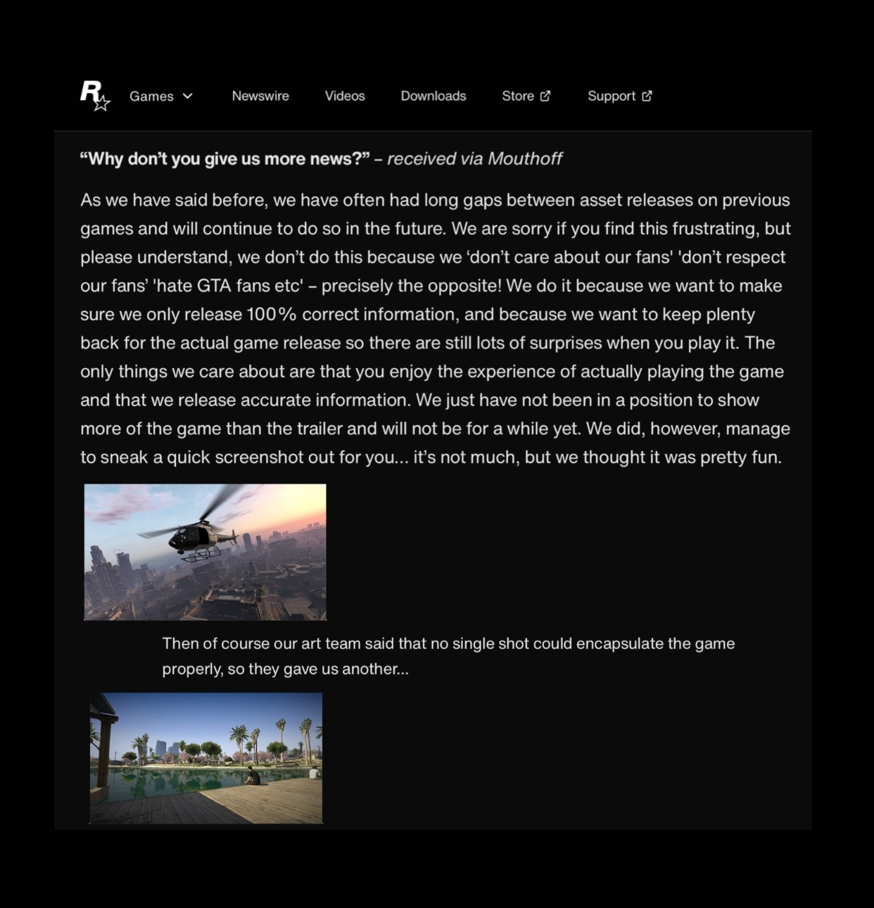 Мы часто делали большие паузы между публикациями материалов по предыдущим играм и будем продолжать так поступать в будущем. Нам жаль, если это вызывает у вас раздражение, но, пожалуйста, поймите: мы не делаем этого потому, что нам якобы «всё равно на фанатов», или «мы не уважаем фанатов» или «мы ненавидим поклонников GTA» — всё как раз наоборот! Мы поступаем так, потому что хотим публиковать только полностью достоверную информацию, а также сохранить многое для самого релиза, чтобы при игре вас ждали сюрпризы. Для нас действительно важно, чтобы вы получили удовольствие от самой игры и чтобы публикуемая нами информация была точной