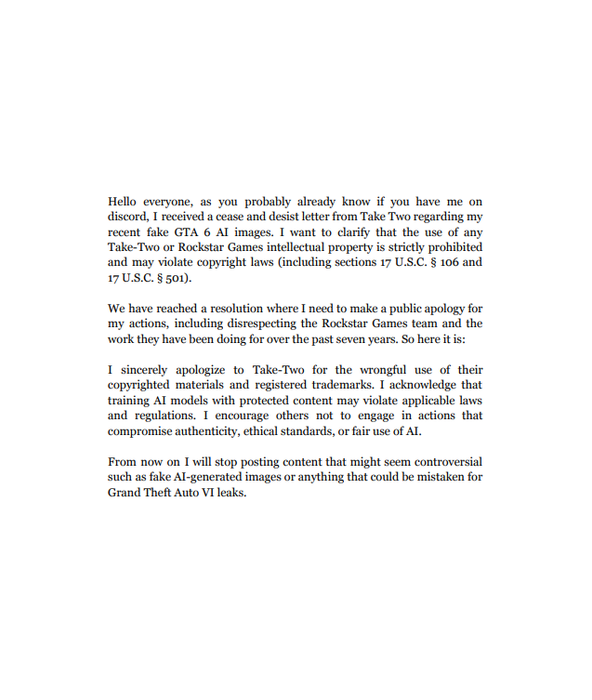 Всем привет. Как вы, вероятно, уже знаете я получил письмо с требованием прекратить деятельность от Take-Two в связи с моими недавними публикациями фейковых скриншотов GTA VI, созданных с помощью ИИ [...] Мы пришли к соглашению, согласно которому я должен публично извиниться за свои действия, включая неуважение к команде Rockstar Games и их работе за последние семь лет [...] С этого момента я прекращаю публиковать контент, который может показаться спорным, например фейковые изображения, созданные ИИ, или что-либо, что может быть принято за утечки Grand Theft Auto VI.