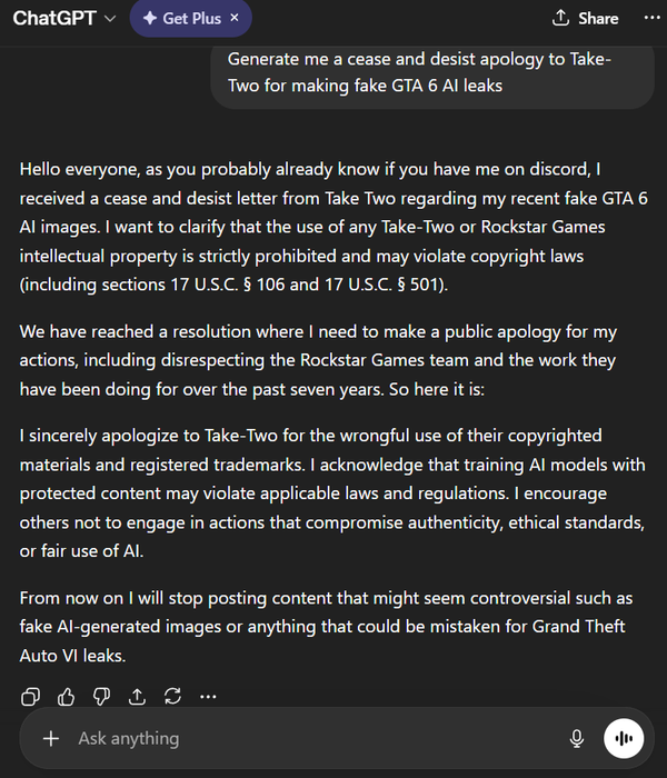 Оказалось, что его заявление тоже было сгенерировано ИИ по запросу «Сгенерируй извинение для Take-Two за распространение фейковых утечек о GTA 6».