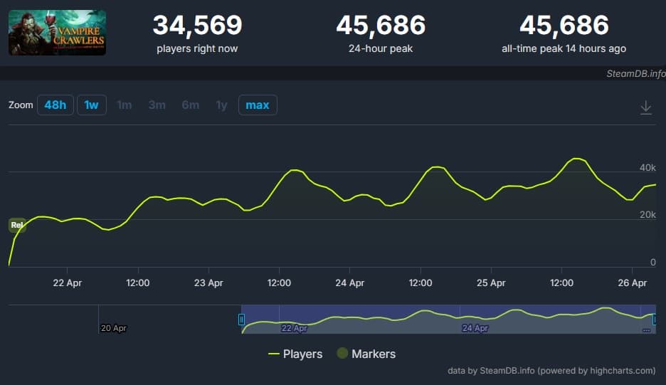 Vampire Crawlers тоже быстро набирает аудиторию: пиковый онлайн в Steam превысил 45 тысяч человек. Для dungeon crawler это уровень, на который обычно не рассчитывают.