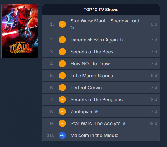 Проект по-прежнему возглавляет американский чарт и удерживает третье место в глобальном рейтинге. И что интересно, на этом фоне зрители обратили внимание на самый спорный проект по «Звёздным войнам» последних лет — «Аколит».