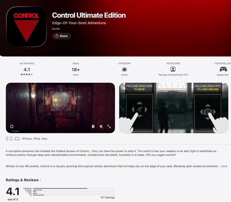 На этот раз решила удивить Remedy Entertainment. Control Ultimate Edition уже доступна на iPhone и iPad за $4,99 – речь о полноценном релизе в App Store, а не стриминговой версии. Разработчики отмечают, что версия для iOS адаптирована под сенсорные экраны: добавлено специальное управление, изменён интерфейс, а также переработаны элементы вроде прицеливания и головоломок, чтобы игра корректно работала на мобильных устройствах.
