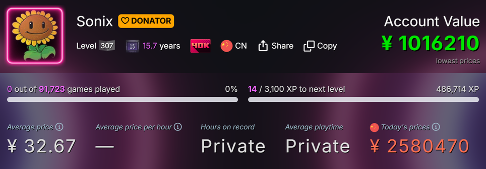 Согласно данным профиля, Sonix из Шанхая (Китай). Калькулятор SteamDB оценивает стоимость его игр на текущий момент в 2 580 470 юаней. Однако некоторые игры могли быть куплены им по скидке, поэтому «вилка» стоимости инвестиций в аккаунт варьируется от 11 до 28 миллионов рублей.