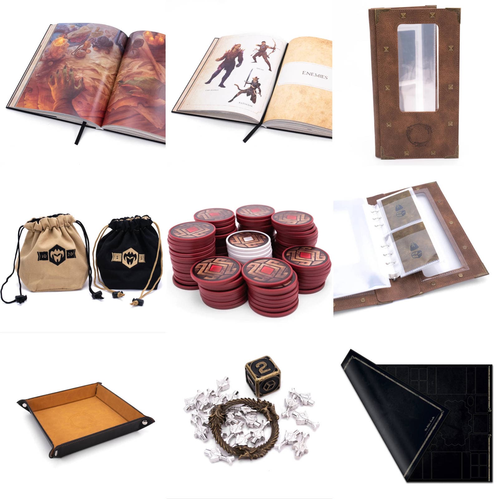 Отдав 3750 рублей, люди получат артбук, 2750 рублей — набор делюкс-мешков, 7490 рублей — большой, неопреновый, прошитый и боевой мат, 1490 рублей — дайс трей (сборная «тарелка» для бросков кубиков).