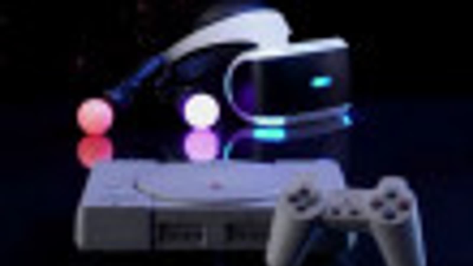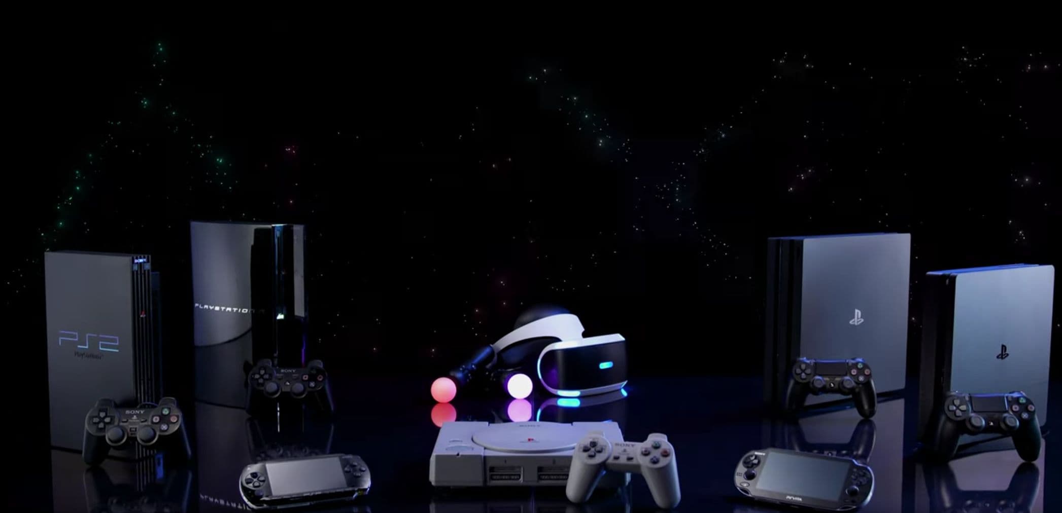 Нам показывают все вышедшие поколения домашних консолей PlayStation, а также портативные консоли PSP и PS Vita и шлем виртуальной реальности PSVR в комплекте с контроллерами движений PS Move.