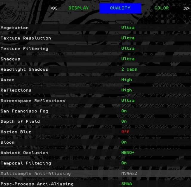 Можно отрегулировать качество геометрии, детализацию, ландшафт, растительность, текстуры, фильтрацию, тени, воду, отражения, сглаживание. Кроме того наш Сан-Франциско можно наполнить туманом, или же полностью его отключить, отрегулировать глубину резкости, настроить область обзора и другое. Полный список настроек на скриншотах.