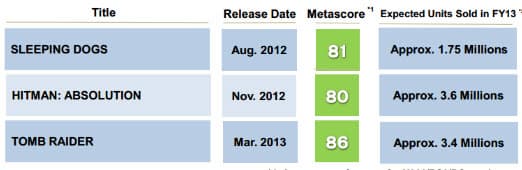 Как стало известно, Sleeping Dogs, Hitman: Absolution и Tomb Raider не выполнили установленный издательством план по продажам. В правой графе указаны ожидаемые продажи игр, по состоянию на 31 марта 2013.