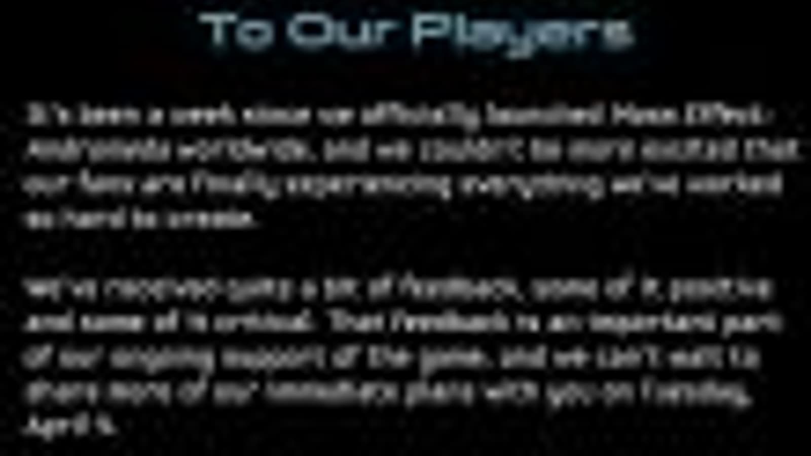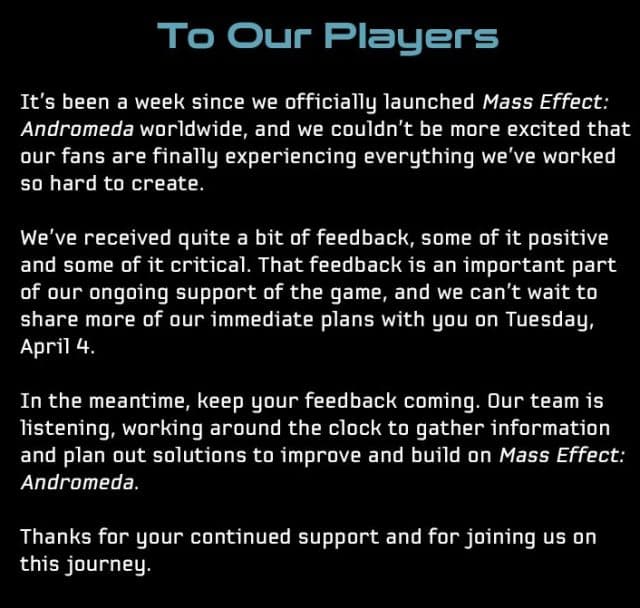В заявлении отмечается, что разработчики трудятся в поте лица, собирают информацию об игре и «планируют решения для улучшения текущей версии Effect: Andromeda». Авторы просят игроков продолжать оставлять отзывы о проекте и уверяют, что прислушиваются к ним.