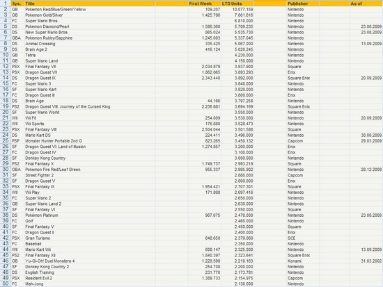 На сайте Nintendo Everything опубликовали список 50 японских бестселлеров за все времена, начиная с Famicom и заканчивая современными платформами. Самыми успешными в финансовом плане играми являются всевозможные покемоны - Pokemon Red/Blue/Green/Yellow для Gameboy - продажи уже превысили 10 млн. копий.