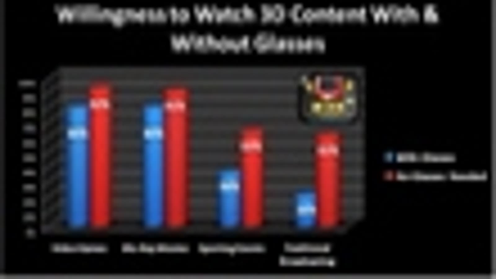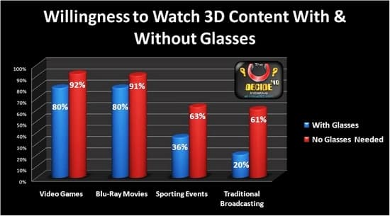 По данным источникам, 80% опрошенных совершенно не против использования очков при просмотре фильмов на дисках 3D Blu-ray, а также во время игр. Уровень готовности пользователей смотреть тот же самый 3D-контент без очков совсем ненамного выше (11-12%).
