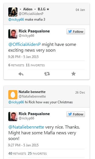 Актер Рик Пасколоне (Rick Pasqualone), который озвучивал нескольких персонажей, включая Вито, в криминальном экшене Mafia II, в своем твиттере тизерит скорый анонс продолжения данной серии.