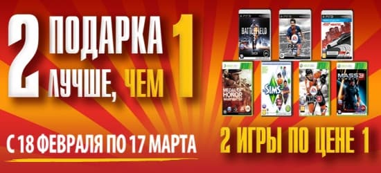 Компания Electronic Arts сообщает о проведении специальной акции для всех поклонников видеоигр - с 18 февраля по 17 марта 2013 года все желающие смогут приобрести игры для Xbox 360 и PlayStation 3 и получить вторую игру для этой же платформы в подарок.