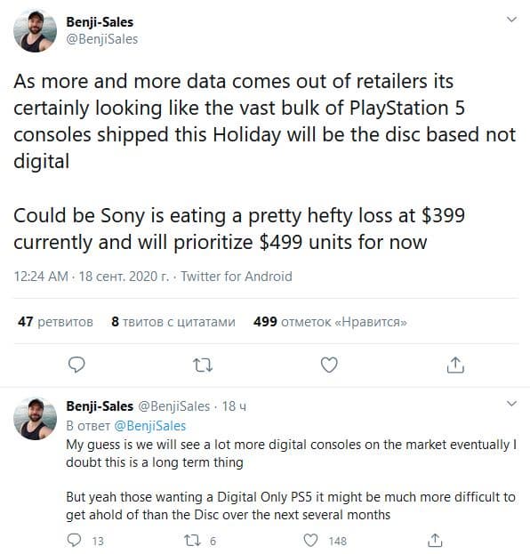 По мнению Benji-Sales, на рынке появится немало цифровых консолей, но в «ближайшие несколько месяцев» купить версию PS5 без оптического привода будет сложнее, чем версию с приводом.