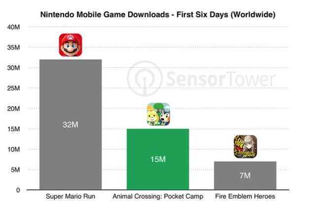 Популярность Animal Crossing: Pocket Camp не сравнима с пробной версией Super Mario Run, которую скачали за шесть дней 32 миллиона раз только в App Store, но мобильная версия Animal Crossing более популярна, чем Fire Emblem Heroes (7 миллионов закачек).