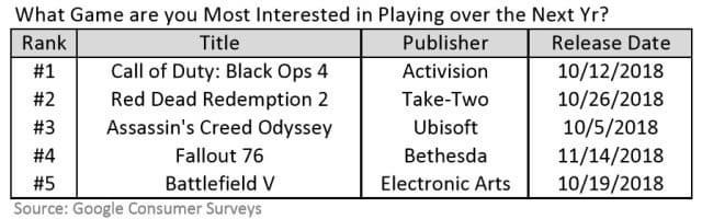 В частности, Piper Jaffray опросили 300 игроков из США и поинтересовались у них, какие из пяти громких релизов этой осени им интересны больше всего. На выбор представили пять проектов: Call of Duty: Black Ops 4, Red Dead Redemption 2, Assassin’s Creed Odyssey и Fallout 76 и Battlefield V. Battlefield V в определенном смысле оправдала название и оказалась на пятом месте списка.