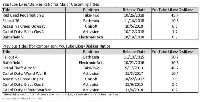 Также аналитики посчитали соотношения лайков и дизлайков у роликов упомянутых выше игр в YouTube. В этом списке Battlefield V вновь оказалась на последней строчке и стала единственной из пяти игр, у роликов которой дизлайков больше, чем лайков. Аналитики отмечают, что подобные данные не являются гарантией недостаточно высоких продаж игр. Однако, по мнению аналитиков, Battlefield V необходимо получить высокие оценки прессы на момент релиза, чтобы выглядеть достойно на фоне конкурентов.